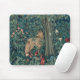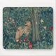 Tapestry of lone fox in a lush forest environment. Deep green leaves, foxglove flowers. William Morris arts and crafts era tapestry.