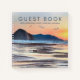 Beach theme vacation rental guest book features a watercolor painting of Morro Rock, sea birds and ocean sunset with text that can be personalized. Perfect for beach, coastal and seaside businesses and vacation home, bed and breakfast or cottage rentals. Art by KL Stock
