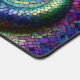 A stylized mermaid showcases a mosaic of shimmering tiles in vibrant hues of blue, green, purple, and orange. The lighting enhances its metallic luster, while an abstract background complements its artistic form.
