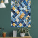 Design: Tiles in varying shades of blue form the background, decorated with golden floral and plant motifs.