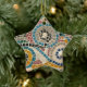 This Christmas ornament features a photo of a mosaic detail. Can be made in different shapes. Colors are gray, blue, pink, white, and yellow. Text on the back says "Christmas 2019" but can easily be customized.