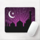 Islamic illustration with silhouettes of the moon, stars and a mosque on a purple night sky.