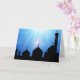 Black silhouette of a mosque on a blue sky with sun and sunburst.