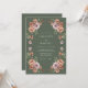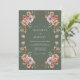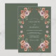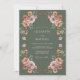 This design features a deep moss green backdrop decorated with moody watercolor florals. The arrangement includes muted mauve roses, terracotta blooms, and soft peach peonies surrounded by delicate foliage. The earthy color palette and organic aesthetic create a romantic feel for autumnal or winter nuptials.