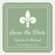 Elegant and simple Wedding Save the Date Stickers featuring a fleur de lis against a moss green background. This design is a unique choice for announcing a modern wedding. Easy to customize with your wedding details. Click "Customize It" to find more personalization options.