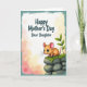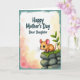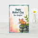 This design shows a soft digital illustration with a small tawny rodent sitting on the lower right, its big blue eyes turned upward with a tender, trusting look ❤️. Pink ears and fine whiskers add gentle detail as it perches on rounded gray stones topped with bright green moss. A slim sprig of leafy green rises beside it, like a quiet nod to care and growing close over time. In the upper left, the message “Happy Mother’s Day Dear Daughter” appears in a flowing style, set in a dark tone that stands out clearly against the light background. Behind everything, warm yellow, peach, and blush shades fade into one another like a distant glow, giving the scene a calm, affectionate atmosphere. A thin aqua-teal border frames the edges, keeping the composition tidy and balanced 🌼. The moss shows tiny textured bumps and the stones have smooth highlights, while the little creature’s paws rest neatly on the top rock.