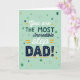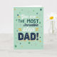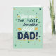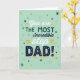 This card shows a mint-green background filled with scattered stars, dots, and tiny asterisk-like shapes in dark blue, green, and orange. The main focus is the message, “You are THE MOST Incredible step DAD!” placed across the center in stacked lines. “You are” and “Incredible step” appear in smooth white cursive-style lettering that feels gentle and caring. “THE MOST” stands out in dark teal, all caps, in a simple printed style, and “step” is marked with short orange-yellow dash lines for emphasis. “DAD!” sits big near the bottom in navy-blue letters with white polka dots, outlined in orange-yellow, so it really catches your eye. The overall look feels upbeat and grateful, like a little celebration on paper, and it’s a meaningful way to tell a stepdad he truly matters ❤️. It’s an easy card to give when you want to show love and appreciation, and it helps you share Valentine’s Day sentiments 🥰.