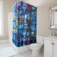 Modern art shower curtain with abstract design created from a digitally manipulated photograph of a stained glass window. The colors are mostly shades of blue but also include red, green and yellow.