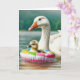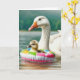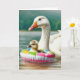 A serene scene features a white goose gliding through the water alongside a fluffy gosling nestled in a colorful inflatable ring.