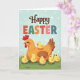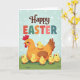 Designed with a springtime farm scene, this card centers on a golden-orange mother hen with a gentle, affectionate look as she rests on a strip of green grass. Her red comb and wattles bring a bright accent, while several fluffy yellow chicks cuddle close, including one perched on her back as if enjoying a cozy piggyback moment. A few chicks gaze outward with curious eyes, and others nestle in with their eyes closed, creating a quiet sense of closeness that feels like friendship in a little family circle. The main greeting sits above the illustration, with the first word in deep brown flowing lettering and the rest in mixed warm tones like coral, leafy green, sunny orange, and muted teal. A small 🌷 touch fits naturally with the fresh palette, and a 🐣-like softness comes through in the rounded shapes and downy textures. The layout keeps the characters low on the page so the text has plenty of breathing room overhead. Behind everything, a pale blue background is dotted with soft white circles that look like floating bubbles.