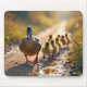 A female mallard duck leads a line of ducklings along a sunlit path with mud puddles reflecting the warm light