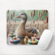A serene pond scene features a mother mallard duck surrounded by her ducklings, each nestled in colorful floating rings among tall cattails
