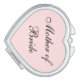 Compact mirror shown in a heart shape with a blush pink background color with Mother of Bride text in black.
