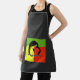 Great color and even though I ordered the kid size, it covers well enough to use during the holidays. I am not a big woman and prefer a shorter apron. I stand 5"6" and the length of the garment goes to mid-thigh. The tie straps fit well at my waist and even though there is no neck strap adjustment, the opening is plenty big enough. I am happy with the size and fit. I am sharing my apron with my 10 year old grandson, too! The color is vibrant and looks good, as shown on the website. The stitching looks strong and reinforced. Photographed is front side and back side of the apron, reinforced straps and coloring. My phone camera may not be the best at showing the details.