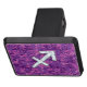 A mother of pearl Sagittarius zodiac symbol on a vibrant fuchsia pink digital camouflage design texture print background. A modern urban racy design for a great custom birthday gift idea.