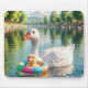 A serene scene features a white duck and a fluffy duckling floating together on a calm river, with the baby duckling inside a colorful inflatable ring