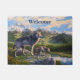 A mother wolf stands on a cliff overlooking a valley below with her two young wolf pups. This scenic country of mountains, rivers, forests, and meadows is the territory belonging to her wolf pack. The original painting is titled "Passing It On" because the mother wolf has brought her pups to this ridge to show them the vast and beautiful wilderness they will inherit when they grow up and take over as leaders of the pack. Accented with a pretty light blue patterned background.