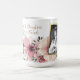 Floral, custom gift mug for mom from a daughter. Add a mother and daughter photo and customize the text. Sample wording is "Mothers and daughters are forever friends". Pretty pink flowers decorate a white coffee mug.