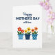 Designed with a bright graphic illustration on a white background, the card centers on the dark blue text “Happy Mother’s Day with love” near the top. The words “Happy” and “with love” appear in a flowing handwritten style, adding a gentle, affectionate touch ❤️. “MOTHER’S DAY” sits between them in a simple, sturdy all-caps style, making the greeting easy to read. Beneath the text, three small potted plants line up in a neat row, like a friendly little garden arranged just for her 🌼. Each pot is blue with a different white pattern—one with stripes, one with dots, and one with tiny hearts—suggesting care and closeness in the details. Thin green stems rise from the pots and hold five-petaled flowers in red, yellow, and orange, each with a darker center. The bottom row shows three blue pots with white stripes, white polka dots, and white hearts, each topped by a single bright flower on a slender green stem.