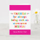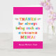 You call your grandmother Mema, not Grandma. Imagine how excited Mema will be to receive a Mother's Day card addressed especially to her! Your mema also will love this Mother's Day card's fun, colorful text-based design that says "Thanks for always being such an awesome Mema! Happy Mother's Day!"