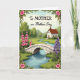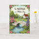 On the front of the card a gentle countryside scene opens around a winding blue river that glints under soft daylight, setting a calm, affectionate mood ❤️. A stone arch bridge curves over the water in the middle distance, like a quiet meeting spot where warm thoughts linger. Across the bank, a small white cottage with a terracotta roof sits among rolling green hills and leafy trees, giving the setting a cozy, lived-in feel. Tall flower stalks rise along the river’s edge, with pink blooms on the left and deep purple blossoms on the right, like two sides leaning toward each other in friendly harmony 🌼. A leafy green border dotted with pink flowers frames the illustration, guiding your eye inward like a gentle embrace. Near the top, the words “To MOTHER on Mother’s Day” are centered, with “To” and “on Mother’s Day” in a neat serif style and “MOTHER” larger and more flowing, all in a dark green tone. The lighting stays soft and even, with delicate shading on the hills, the bridge stones, and the cottage walls. Small pink flowers curl through the green foliage border at the corners.