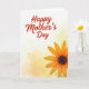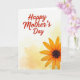 This card features the words “Happy Mother’s Day” placed in the upper left in rich red lettering, standing out like a warm note on a quiet morning ❤️. A large flower fills the lower right corner and is slightly cropped by the edge, as if you’re leaning in close to admire it with someone you love. The petals stretch outward in long, narrow shapes, shifting from bright orange at the tips to softer golden tones nearer the center, creating a gentle, caring mood. Fine shading along the petals adds depth, like a soft touch that lingers. At the center sits a dark round disk dotted with tiny yellow details, giving the bloom a focused, attentive look. Behind everything is a pale cream background washed with light yellow, like sun through a thin curtain 🌼. The red message stays clear against the light backdrop while the flower’s warm colors glow in the lower right. The flower’s orange petals radiate around the dark center with small golden specks clustered near the middle.