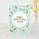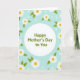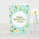 This design shows a light blue background with a large white circle centered like a spotlight on the message. Inside the circle, the text “Happy Mother’s Day to You” sits neatly in the middle in a muted olive-green font, easy to read and gently styled. Around the circle, white flowers with sunny yellow centers lean inward, like a close ring of loved ones gathered near ❤️. Soft green leaves weave between the blooms, forming a natural border that feels calm and affectionate rather than formal. The flat illustration style keeps shapes simple and smooth, letting the cool blue, crisp white, and relaxed greens carry a quiet, friendly warmth 🌼. Small white dots are scattered across the blue space, resembling tiny dewdrops or light confetti drifting in the air. The white petals are rounded and evenly spaced, and the yellow centers glow like small coins against the surrounding foliage.