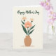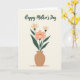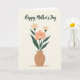 This card features a calm floral illustration on a muted cream background, with a terracotta-colored vase centered at the bottom holding a bouquet that feels like a gentle hug ❤️. Deep forest-green stems and leaves rise upward and lean toward one another, creating a cozy, close-knit look. In the middle, a peachy-pink flower opens wide with a softly textured center dotted in warm golden-ochre, like tiny grains of pollen. Two smaller flowers sit nearby in pale creamy tones, their lighter petals giving the arrangement a tender, companionable balance 🌼. Near the top, the phrase “Happy Mother’s Day” is placed above the bouquet in flowing dark green lettering that mirrors the curved shapes of the leaves. The text sits centered and spaced so it feels airy, leaving plenty of breathing room between the words and the flowers. The overall palette stays soft and pastel, with gentle contrasts that keep the scene soothing and affectionate. The vase has an organic rounded shape with a slightly uneven rim, and the bouquet fans out in a simple arc above it.
