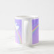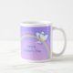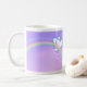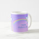 A mug with my original digital artwork of two white and blue hearts over a rainbow in a mauve or lilac colored sky. Customizable text says "Happy Mother's Day".