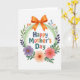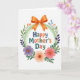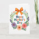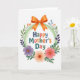 On the front of the card, a white background holds a circular floral frame that gently wraps around the main greeting, giving the whole design a caring, close-hug feel ❤️. In the center, the words “Happy Mother’s Day” sit neatly, with each letter in a different color—deep blue, orange, soft green, and warm coral—so the message feels bright without being loud. A light green ring with a subtle texture forms the base of the wreath, like a soft ribbon looped into a circle. Around it, painted flowers and leaves lean inward toward the text, creating the look of a tender gathering rather than a stiff border. At the top, a large orange bow is placed like a gift tie, with shaded folds that make it look gently tucked into the greenery. On the lower left, a purple flower with a yellow center stands out, while on the lower right a peachy-orange bloom and a pink flower sit close together like friendly companions 🌼. Darker purple foliage, green leaves, and small blue and orange botanical accents fill the remaining spaces, with fine lines on the petals and leaves adding detail.