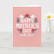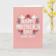 This design shows a soft coral-pink background with a centered greeting that feels affectionate and close ❤️. The main line, “Happy Mother’s Day,” sits in the middle in large white letters with a slight shadow that makes them look gently raised. Just below it, “with Love” appears in smaller white flowing lettering, tucked neatly under the main phrase like a quiet aside. A rounded wreath frames the text, made of deep teal-blue leaves and red flowers that lean inward as if cradling the message 🌼. Two white birds face each other at the top of the wreath, wings lifted and bodies angled in a tender, mirrored pose. The flowers are scattered between the birds and along the sides, adding soft pops of red against the pink field. The overall layout is balanced and calm, with the botanical border forming an even oval around the centered words. Subtle shading under the white letters and along parts of the wreath adds depth while the birds remain bright and smooth against the coral background.