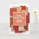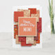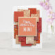 This greeting card centers on a rectangular orange card framed by a cream scalloped border with tiny white dots, giving it a cozy, affectionate look ❤️. In the middle, the message “Happy Mother’s Day MIMI” appears in crisp white lettering that stands out clearly against the orange. Around it, overlapping paper swatches create a layered backdrop in deep reds, oranges, terra cottas, and soft creams, like a warm collage gathered with care. The patterns mix floral curls, stylized leaves, and small snowflake-like motifs, adding gentle movement and a sense of closeness between all the elements. Near the lower left, an orange patterned piece features three stitched buttons in blue, yellow, and green, a small detail that feels like a friendly touch 🌼. Bright, even lighting brings out the paper textures and the thread, while soft shadows make the layers look slightly raised. The text sits centered on the main orange card, with the surrounding patterned pieces angled and overlapping to frame it. Tiny white dots trace the cream scalloped edge, and the three buttons line up neatly on the lower-left swatch.