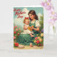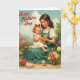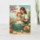 This design shows a gentle woman seated in a garden, cradling a small child on her lap as they read a bright yellow book together ❤️. Her soft downward gaze meets the child’s focused look, and the closeness of their cheeks suggests an affectionate, trusting bond. The woman wears a white blouse under an emerald-green pinafore, while the child has rosy cheeks, a red hair bow, and a simple white dress that keeps the scene timeless. Around them, layers of flowers in crimson, coral, peach, and sunny yellow bloom against distant trees and a lightly clouded sky 🌼. The lighting is soft and airy, giving the setting a calm, dreamy feel without overpowering the details. Near the top, the phrase “Happy Mother’s Day” appears in flowing dark lettering, centered above the figures. On the ground below, scattered petals sit beside a small decorative treat cup and a greeting card lying near the hem of the woman’s dress.