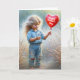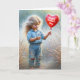 Cute little girl wearing denim ripped blue jeans and holding a red heart balloon in a country field for Mother's Day.
