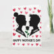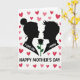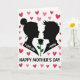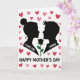 This card features two black silhouette figures in close profile, a feminine figure with a neat bun facing a masculine figure with sharp hair, their faces angled toward each other with a tender, familiar closeness ❤️. Between them sits a single black rose head, and its green stem draws the eye like a quiet link connecting their shared focus. The background is white, sprinkled with small hearts in pink and deep red that float around the pair like soft confetti 🌼. On the feminine silhouette, the words “I LOVE YOU” appear in white lettering, positioned along the upper torso so they stand out against the dark shape. On the masculine silhouette, “I KNOW” is also set in white lettering, placed across the chest area as a calm, answering reply. Centered beneath the figures, “HAPPY MOTHER’S DAY” is written in black, aligned neatly under the scene with balanced spacing. The hearts are scattered mostly around the upper half of the card, with a few drifting near the sides around the rose.