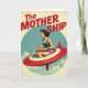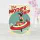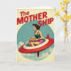 This design shows a retro-future scene with a glamorous woman seated in the open cockpit of a sleek crimson flying craft, trimmed in white with a clear dome. Her dark hair is swept into a classic updo, and her calm profile and steady posture suggest confident care, like she’s piloting somewhere special for someone she loves ❤️. She wears a bright green sleeveless top and pink shorts, adding a fun mid-century look to the scene. In both hands she balances a white plate piled with golden-brown cookies speckled with dark bits, a cozy gesture that feels like sharing treats with a close friend or family member. The background is a pale blue sky with soft white clouds, contained inside a large light-blue circle that frames the action. Across the top, the words “The MOTHERSHIP” appear in chunky crimson letters, centered and standing out clearly against the sky. 🌼 The craft angles left as it glides through the circle, with gentle shading under the cockpit and along the red body.