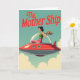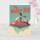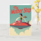 This design shows a retro sci‑fi scene that mixes nostalgic styling with a gentle dash of the future. Across the upper area, the title “The Mother Ship” appears in red cursive lettering, standing out against the calm aqua sky. Center stage, a glossy cherry‑red flying saucer with gray details and small round windows drifts along as if arriving with affectionate care ❤️. Inside the clear bubble cockpit, a stylish woman sits with neatly set dark hair, wearing a bright green top and soft pink trousers. Her relaxed posture and attentive gaze suggest a warm, friendly welcome, like she’s bringing comfort to someone she cares about. She holds a silver tray with golden‑brown baked treats, turning the space journey into a sweet, homey moment 🌼. Along the bottom edge, creamy, stylized clouds form a soft border beneath the hovering craft.