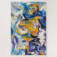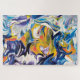 Colors ebb and flow, creating waves of motion in this abstract. Hues of blues, yellows, oranges and purples balance the composition of this painting. As you piece the puzzles together, how many faces will you find hidden?