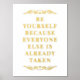 Beautiful, elegant, and simple real gold foil printed motivational Be Yourself Because Everyone Else Is Already Taken quote. This elegant, stylish, and trendy gold foil poster with a vintage, elegant, and chic minimalist typography script aesthetic is a perfect motivational, inspirational, and encouraging birthday gift.