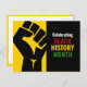 Motivational BLACK HISTORY MONTH postcard showing black raised fist graphic against a rich yellow background on the left, and CELEBRATING BLACK HISTORY MONTH in bold white, red, yellow, green typography set against a rich black background on the right. On the reverse there is a CUSTOMIZABLE greeting which you can personalize with your own wording. A great way to keep in touch over the Black History Month season. Other varieties of BHM cards, invitations, clothing and decor are available.