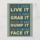 "Life is short - LIVE IT, Love is rare - GRAB IT, Anger is bad - DUMP IT, Fear is limiting - FACE IT". See my store for items with this design.