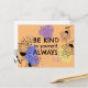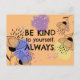Send a beautiful message of self-love and encouragement with this artistic motivational quote postcard. The front features the inspiring phrase "Be Kind to Yourself. Always." set against a warm, sunny orange background accented by vibrant purple, yellow, and pink watercolor splashes.