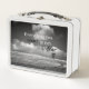 This is a standard metal lunchbox that appears to work just fine. We designed this box ourselves with an uploaded photo and custom text on the front and back. It looks absolutely beautiful except the front of the lunchbox is not centered like it shows in the photo. The print borders don't align with the inset flat part of the box where the preview photo online showed it perfectly centered in there. The back looks nice and centered though.