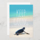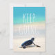 A baby turtle on the beach is trying to reach the ocean with a quote that says: Keep going.