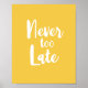 A motivational quote art print that says Never Too Late in a colorful yellow and white typography design.