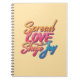 Spiral Notebook. Multicolor motivational words "Spread Love, Share Joy" notebook design. This spiral notebook features a classic yet unique design, with vibrant multicolor fonts on both the front and back covers. The trendy layout and eye-catching hues make it stand out, perfect for those looking to add a pop of color to their daily notes. Ideal for students, professionals, or creatives, this notebook combines practicality with style, making it a must-have for anyone seeking both functionality and flair.