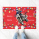 A rectangular doormat with a red background, featuring a vibrant and dynamic illustration of a motocross rider mid-action, splattered with colorful abstract paint. The mat is bordered by a string of multi-colored Christmas lights, adding a festive touch. The text "Welcome Friends" is written on the left side and "Merry Christmas" on the right, making it a cheerful and welcoming holiday accent.