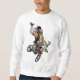 A grinning, tongue wagging, cartoon, green monster motocross rider grabbing some big air on t-shirts, sweats, novelty gift swag.
