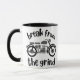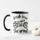 A coffee mug featuring a monochromatic retro motorcycle, with the phrase "Break from the Grind" centered around the image. The design suggests a sense of adventure and freedom, offering a peaceful escape from the daily routine.