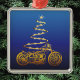 Gold retro motorcycle with a Christmas tree and stars motif on a bright blue gradient background for bikers.